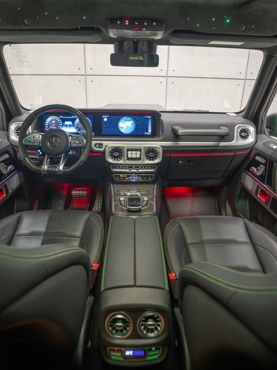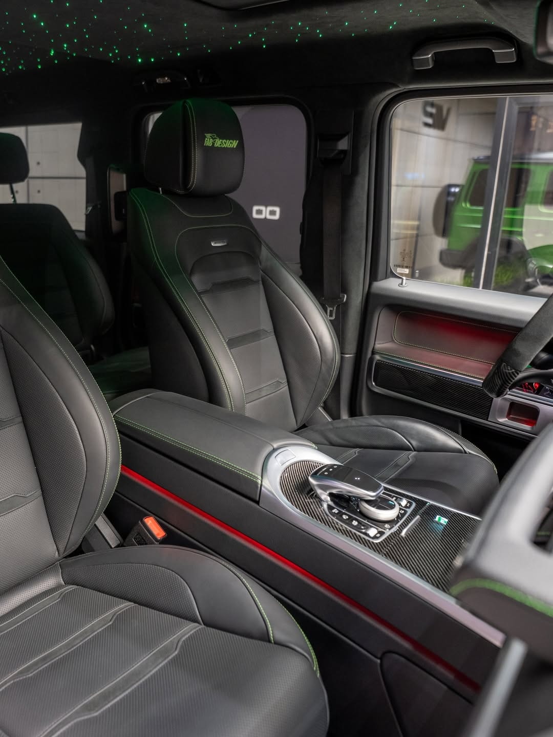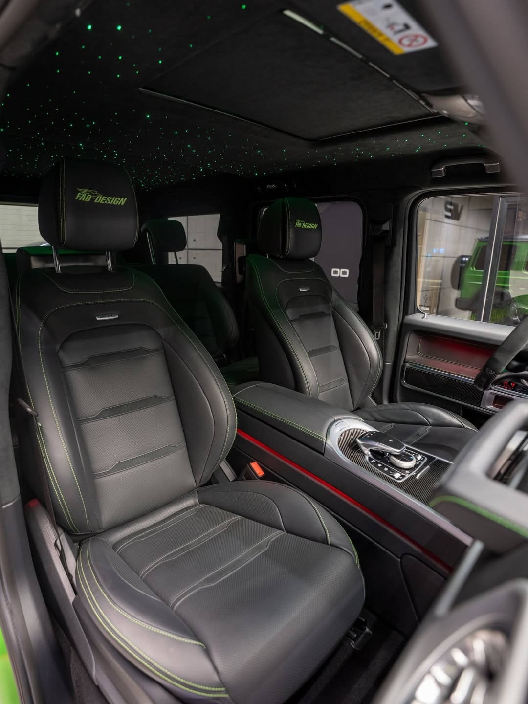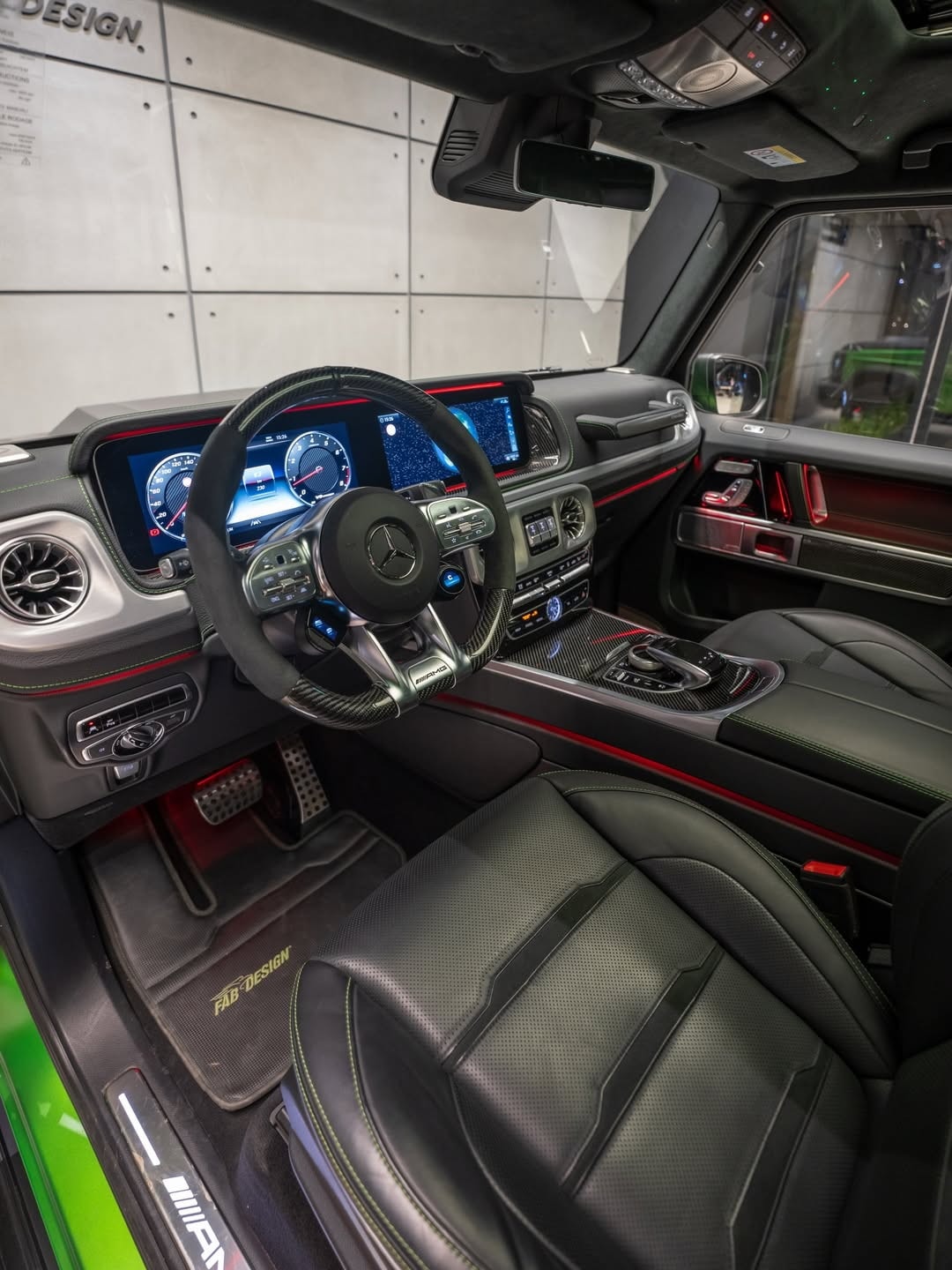 The changes continue inside. Fab Design has reworked the cabin with new black leather upholstery stitched in light green, and the headrests carry the company’s logo. Extra carbon fiber appears on the center console and the steering wheel, and there is also a new set of floor mats. In front of the passenger, the dashboard grab handle reads “G Manufaktur.”
