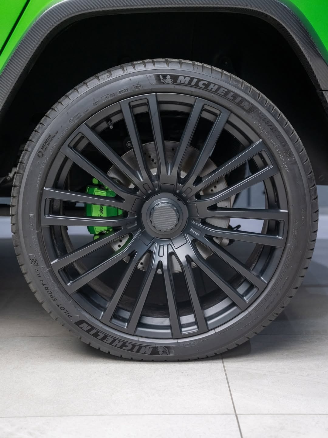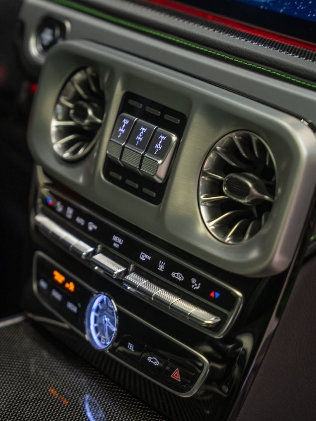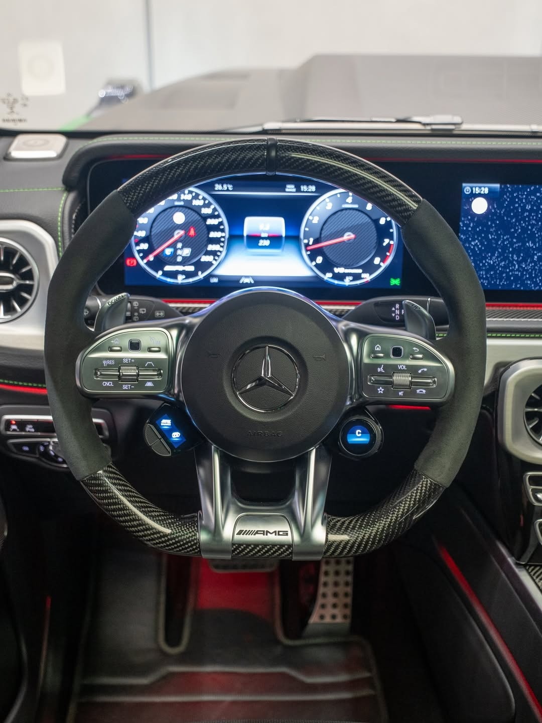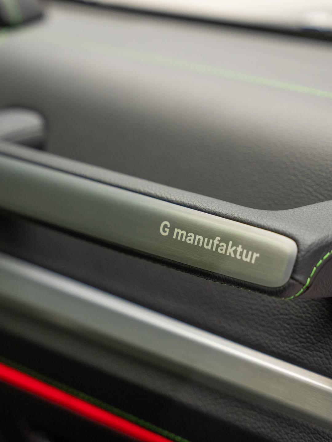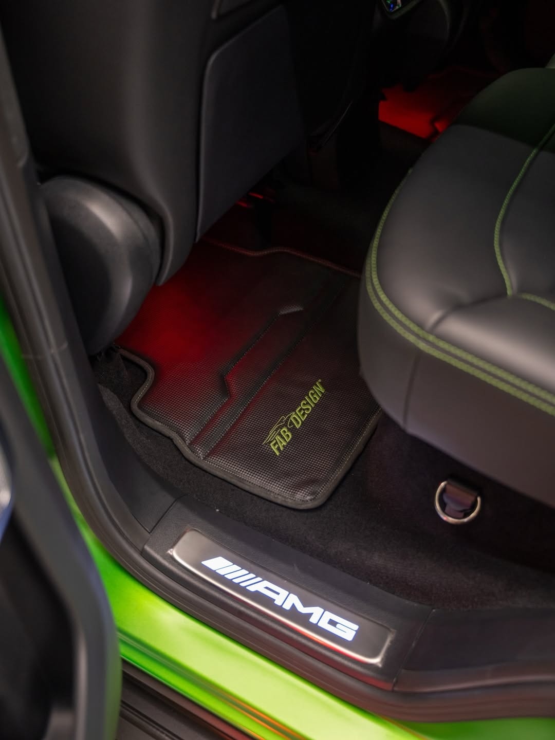 The changes continue inside. Fab Design has reworked the cabin with new black leather upholstery stitched in light green, and the headrests carry the company’s logo. Extra carbon fiber appears on the center console and the steering wheel, and there is also a new set of floor mats. In front of the passenger, the dashboard grab handle reads “G Manufaktur.”