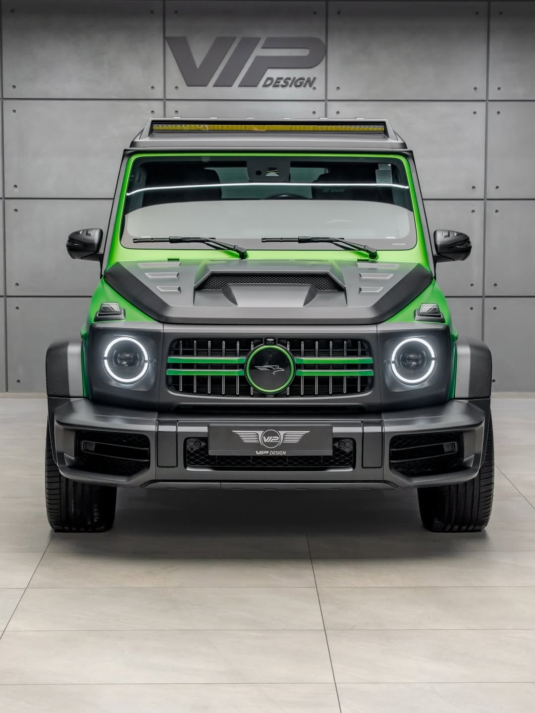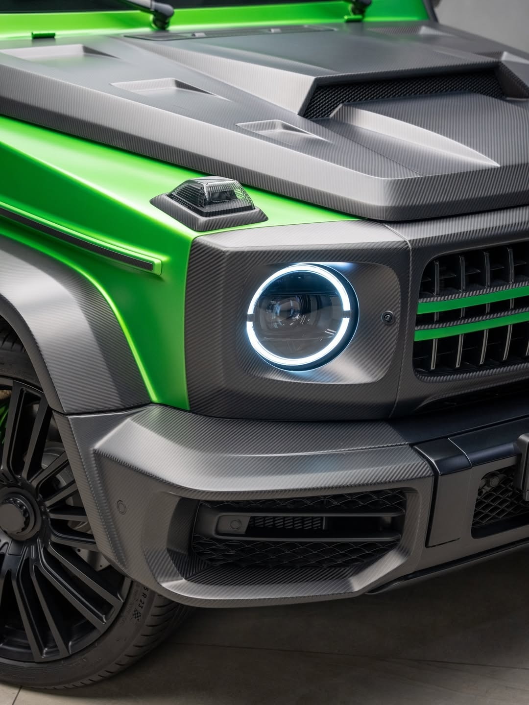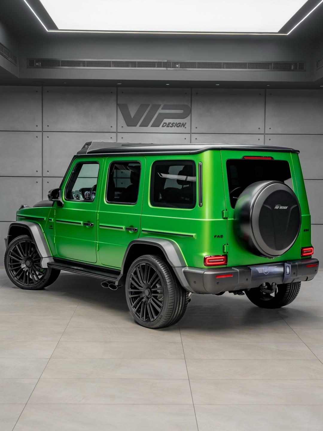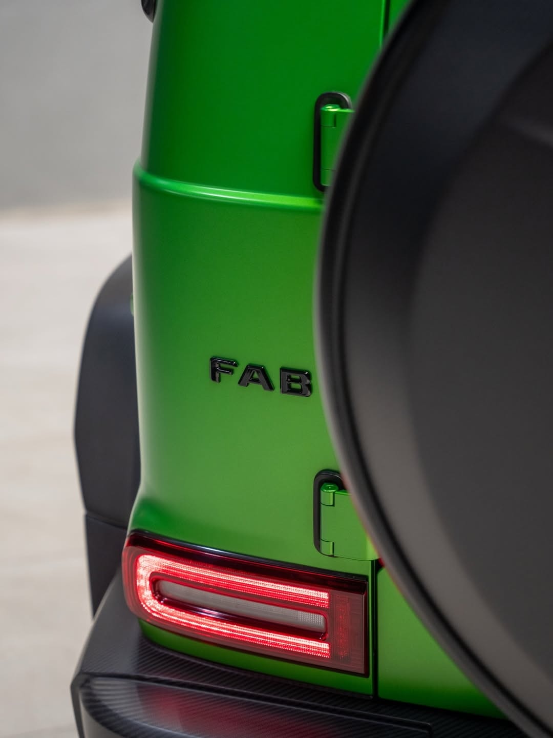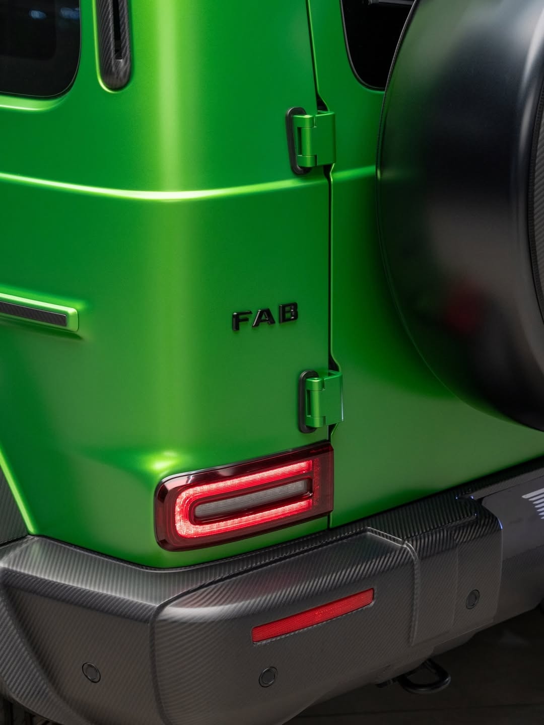 The exterior uses a bi-tone theme that combines matte carbon fiber with a lime green paint finish. Or finish, at least — that is the material and color combination described here. Carbon fiber shows up on the front bumper, the redesigned grille, the headlamp surrounds, the grille again, the vented hood, and the roof piece. There are also new side steps, a carbon fiber rear bumper, and a custom spare wheel holder. Fab Design’s own logo replaces the Mercedes three-pointed star on the nose, while the wheels and the door mirror casings come from the aftermarket world as well.