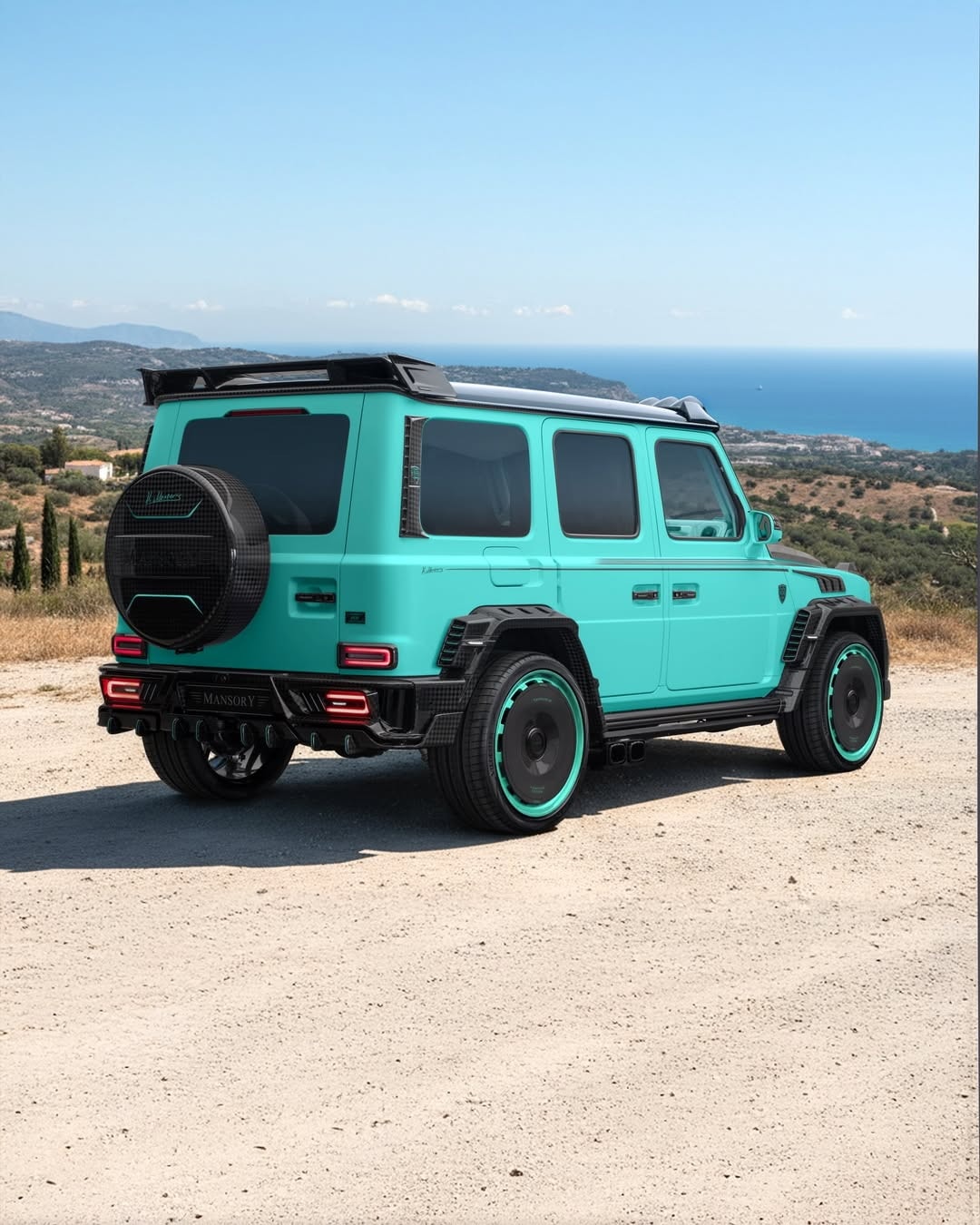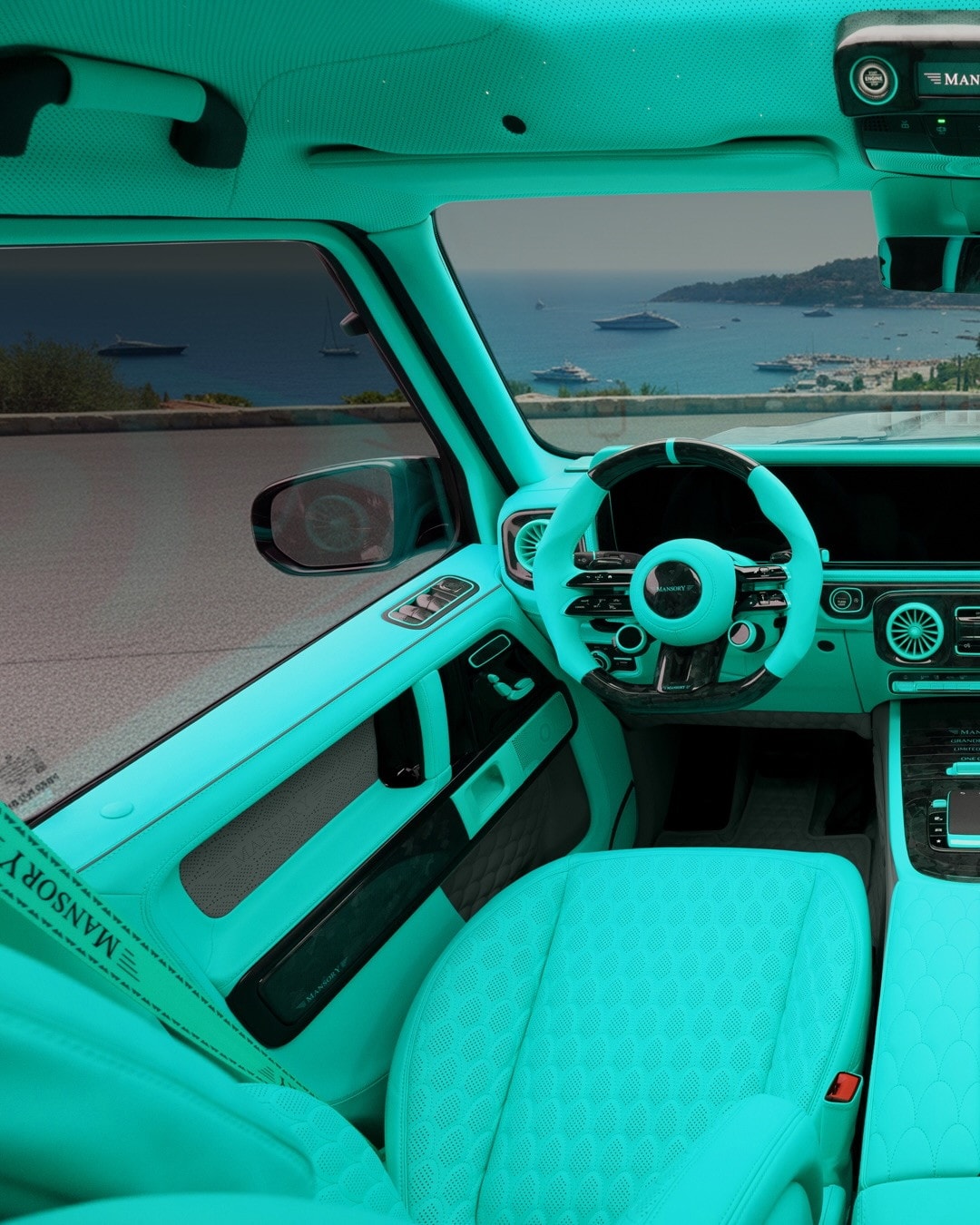 Moving inside, the cabin adopts a mint tone, thanks to teal leather upholstery in contrast with black accents. Again, Mansory has put its own signature on the seatbelts, steering wheel, or the grab handle in front of the passenger.