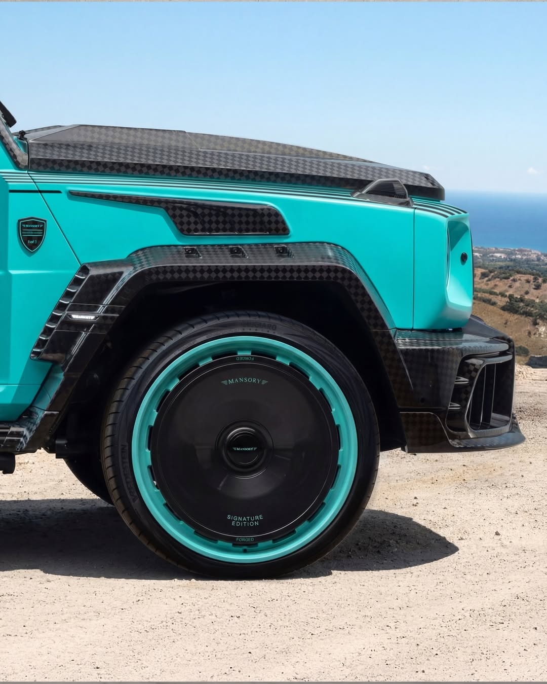 New set of wheels, finished in a two-tone teal and black combo, complements the whole body kit, while naked carbon fiber tweaks across the body reinforce the overt customization.